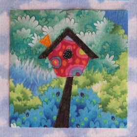 The other theme was birdhouses. I made a little leaning birdhouse, bright fun colors. This one is raw-edged applique which I find much faster for me to do than paper-piecing! I waste less fabric, too. I also just found out that using a size 60 needle in the machine leaves cleaner edges on the fabric that is being appliqued! Tiny needle, tiny holes, no raggedy bits!